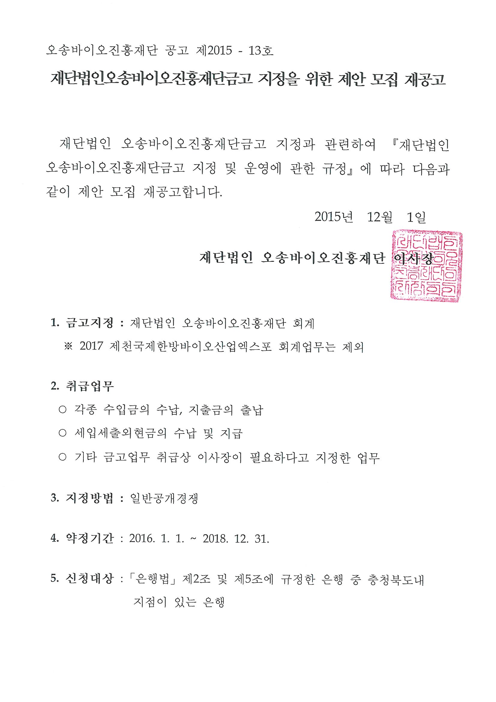 재단법인오송바이오진흥재단금고 지정을 위한 제안 모집 재공고