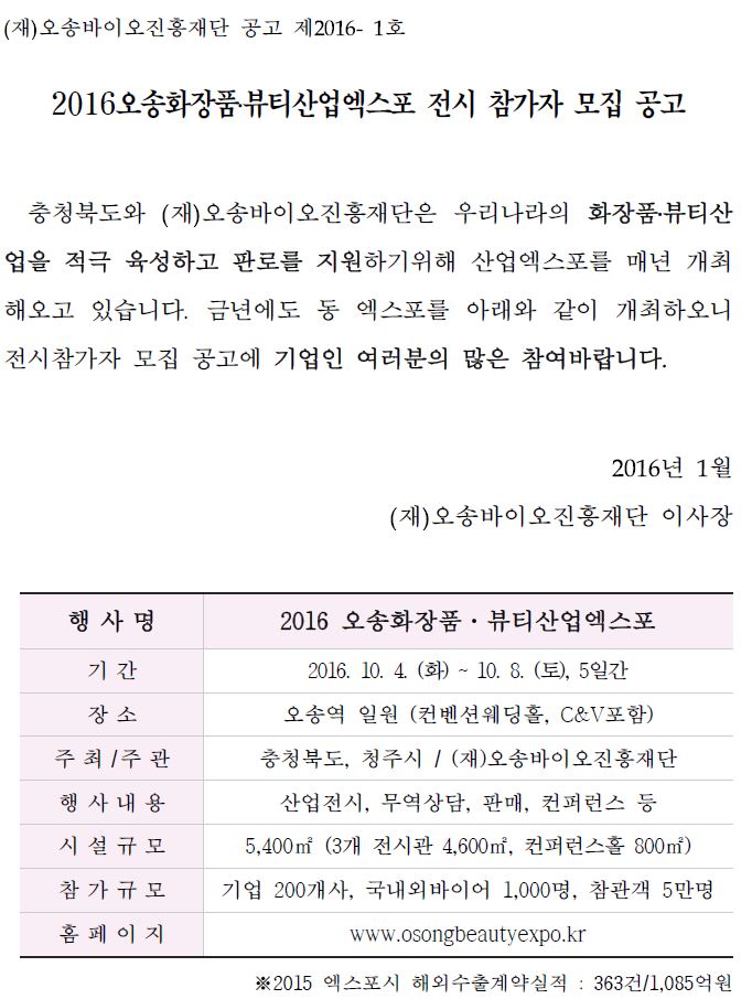 2016 오송화장품뷰티산업엑스포 전시 참가자 모집