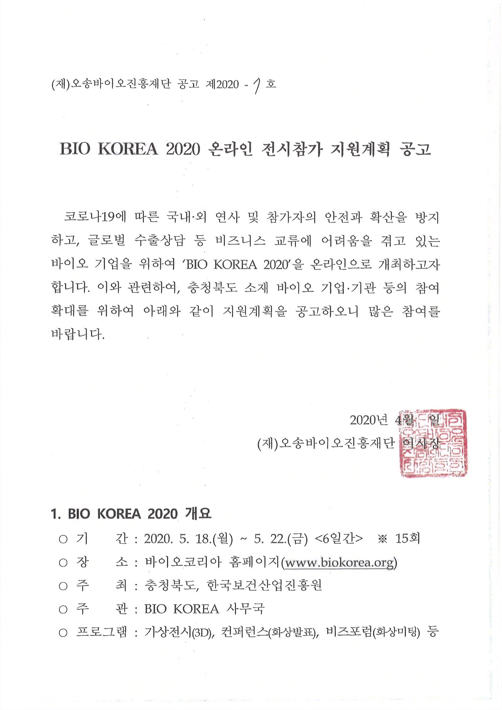 BIO KOREA 2020 온라인 전시참가 지원계획 공고