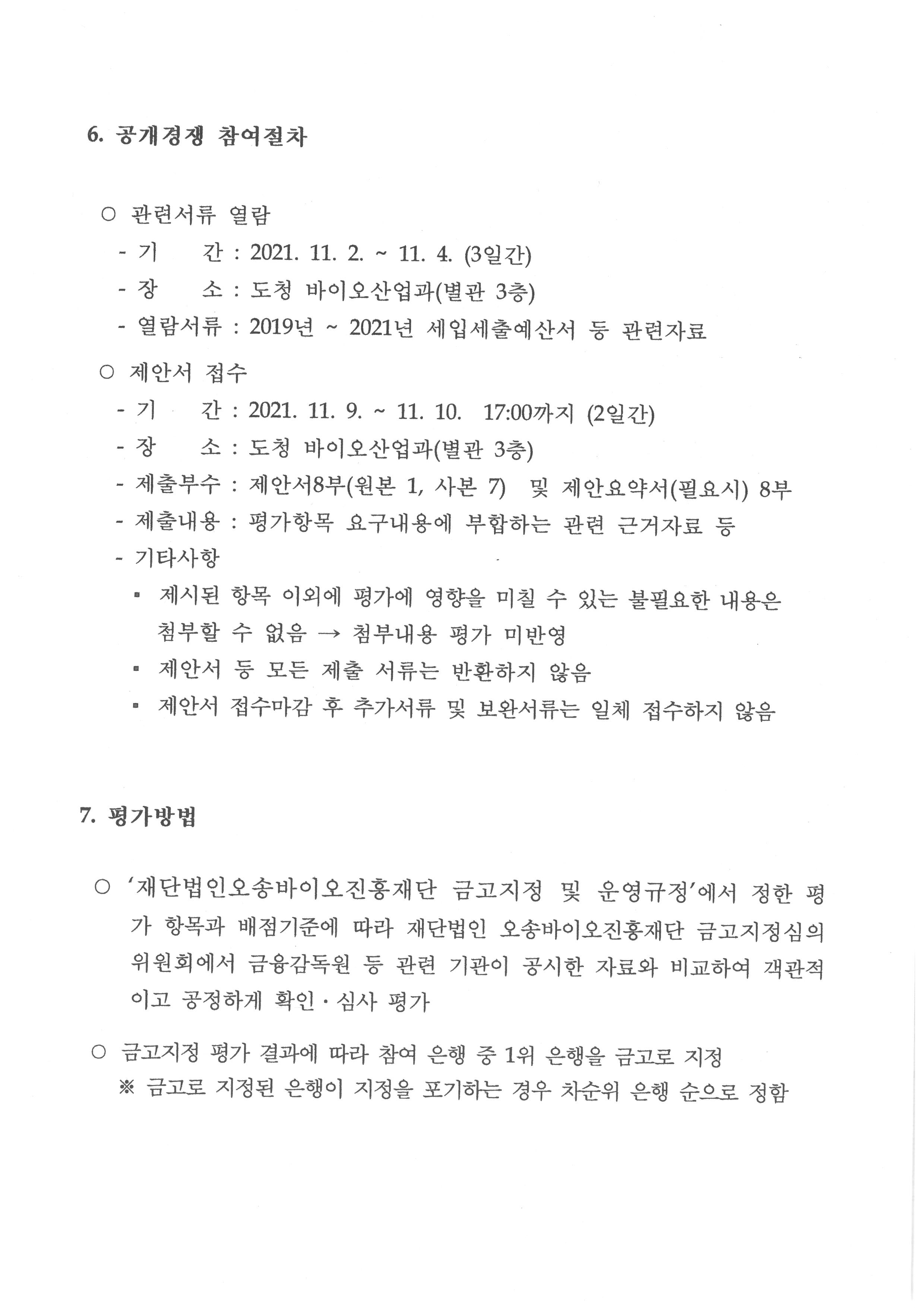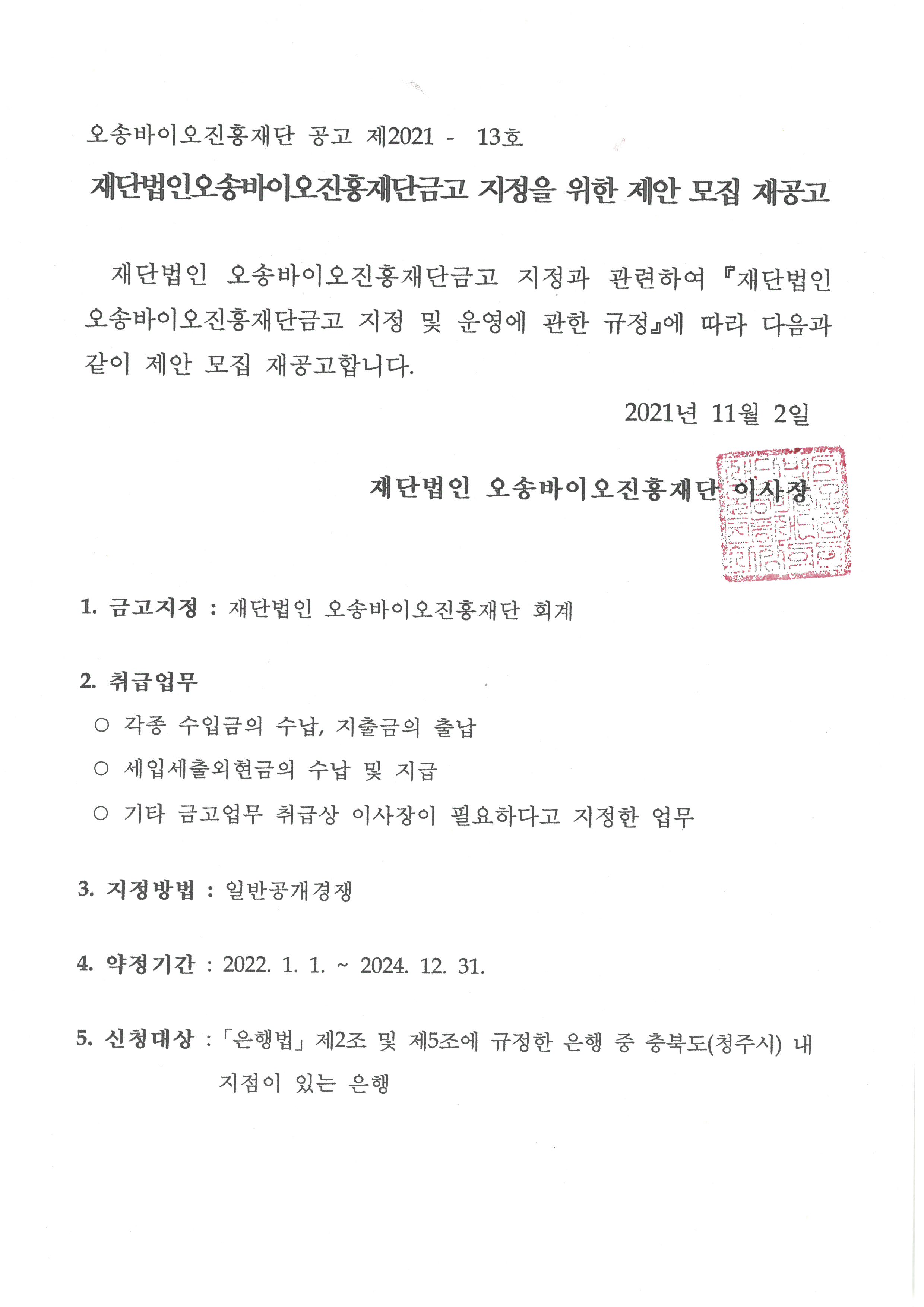 (재)오송바이오진흥재단 금고 제안 모집 재공고