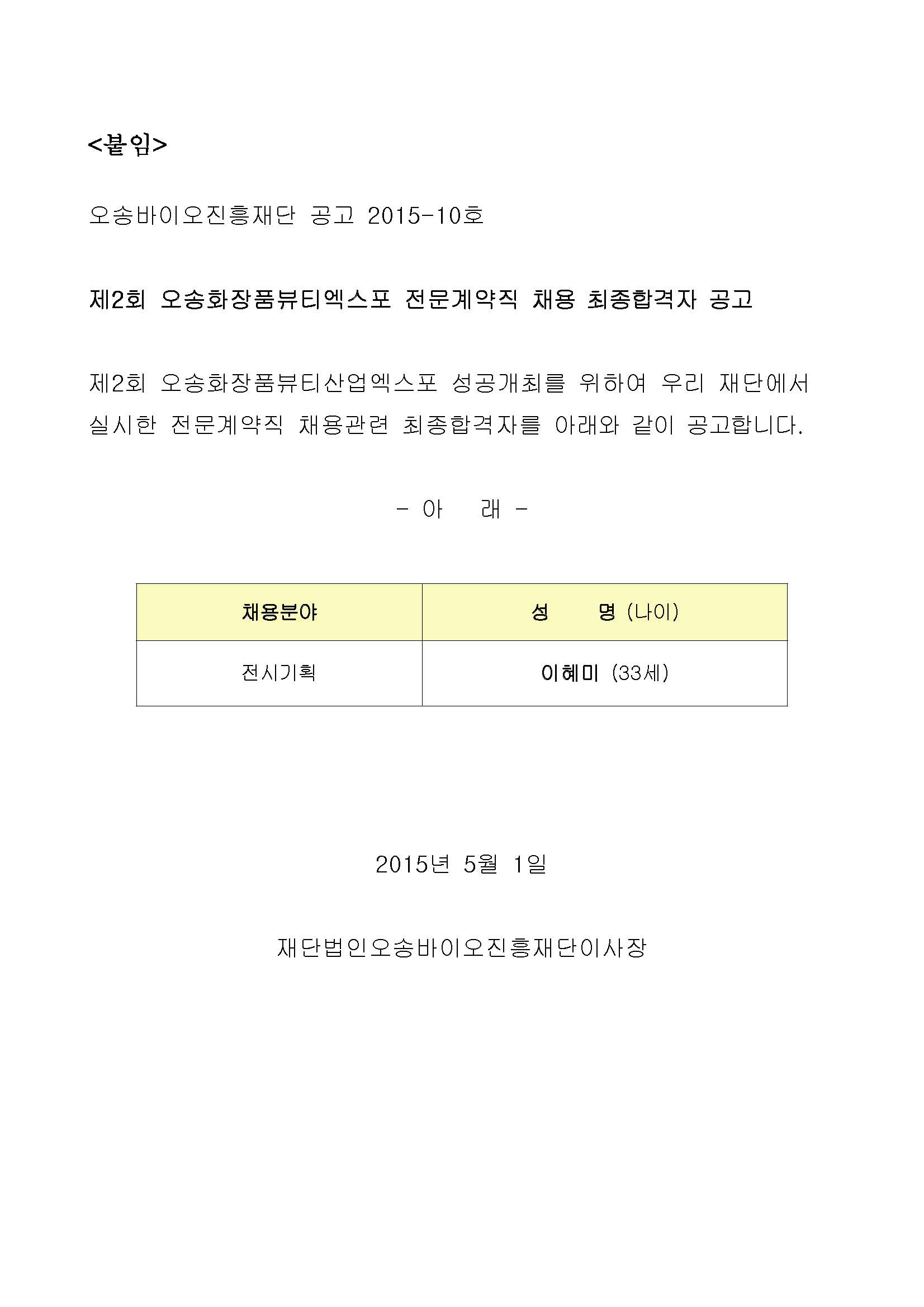 (재)오송바이오진흥재단 무기계약(기능직 행정원) 근로자 채용공고