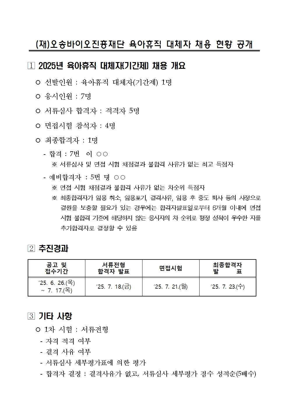 (재)오송바이오진흥재단 육아휴직 대체인력(기간제) 채용 현황 공개